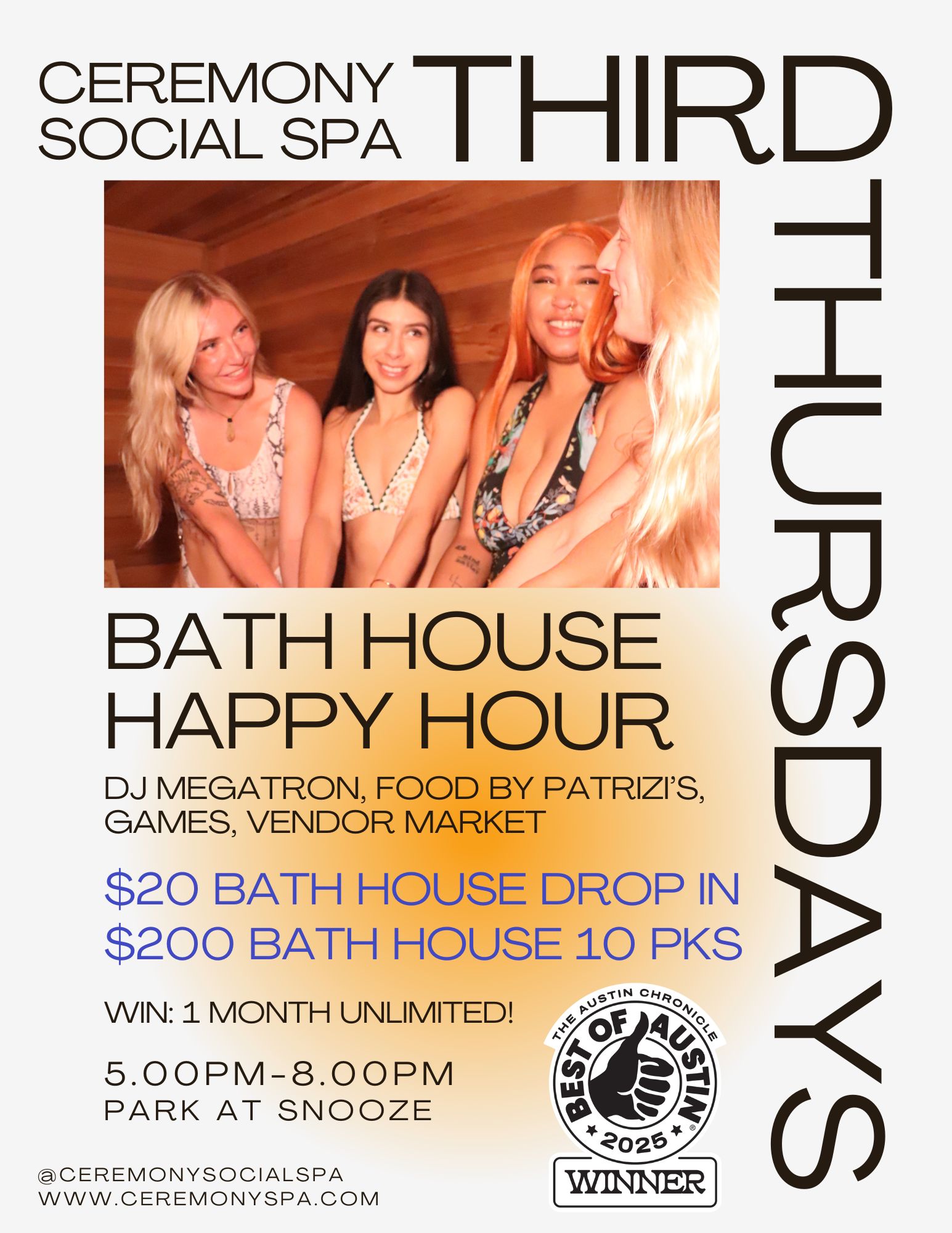 Austin’s favorite social spa is turning up the heat (and the chill) this Third Thursday with a night you don’t want to miss. At Ceremony, wellness is more than self-care—it’s a shared experience. This month, we’re bringing together hot saunas, so many cold plunges, refreshing mini-scrubs, live music, local vendors, and even a pop-up from Patrizi’s to make it unforgettable.